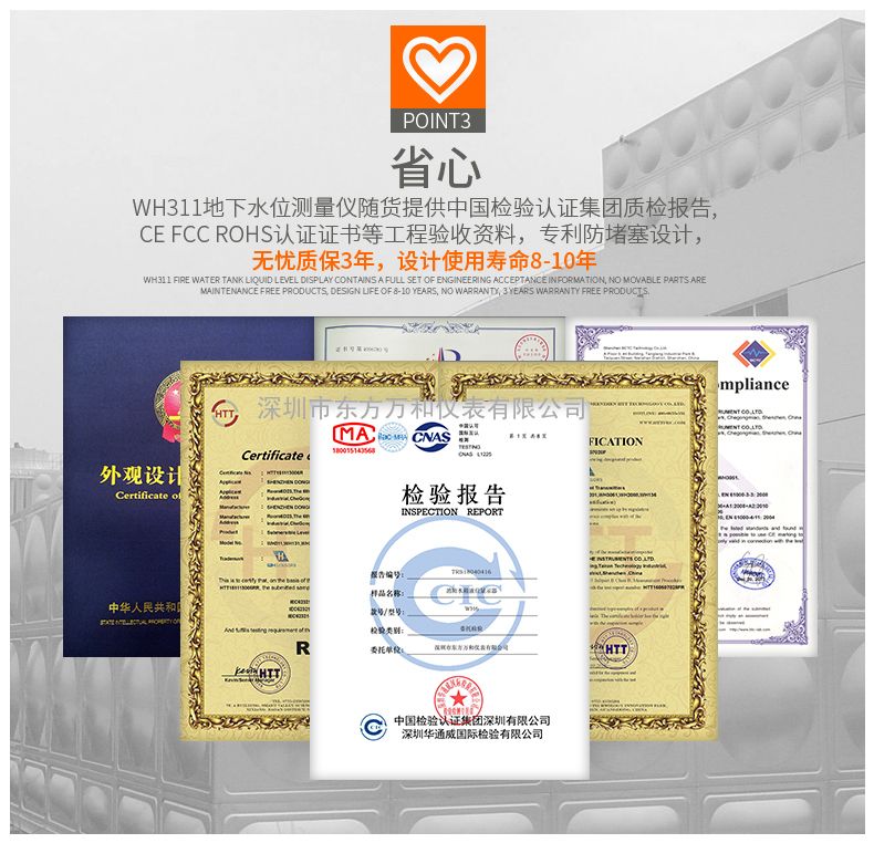 深圳市东方万和仪表生产的水泵水位自动控制器 WH311水位显示仪采用美国德州仪器(TI)公司,原装芯片放大电路,大大提高传感器信号输出的稳定性。用户可自行用2X1.5平方屏蔽电缆将水位探头从消防水箱(水池)现场延长到消防控制中心连接WH6液位显示表,高性能的芯片大大减弱了信号衰减,*远传输距离可以达到5公里。