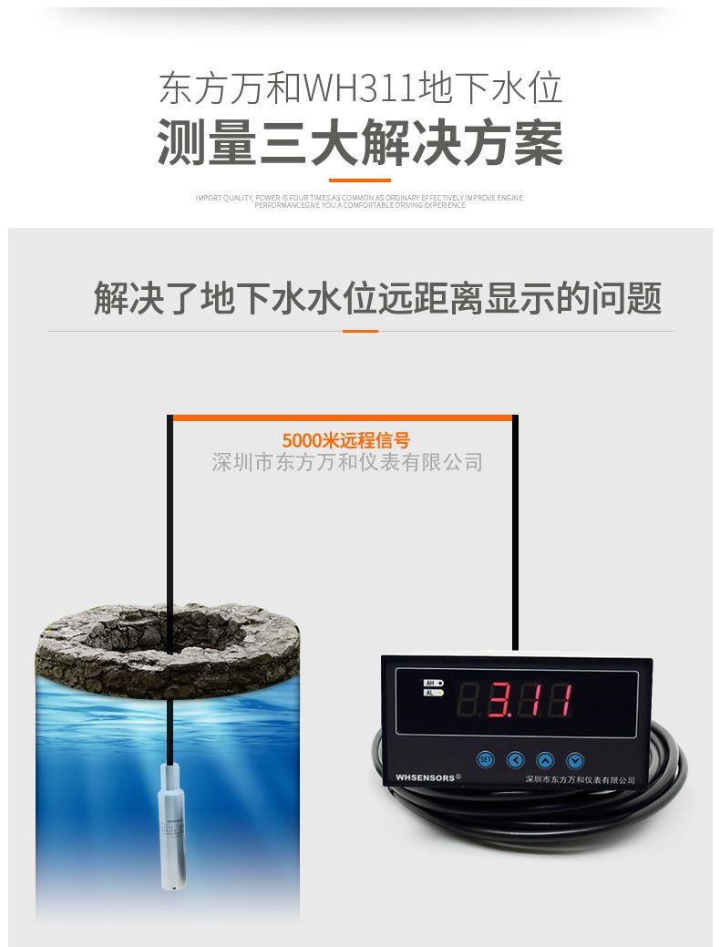 显示器会有两个继电器开关量输出,在低位的时候(这个值用户可以根据工艺自行设置)自动停泵。钢丝电缆(放的过程中,一定要注意对电缆的保护),确保测量信号实时的,高精度稳定的输出聚氨酯信号传输采用军工级别的WH311地下深井水测量仪