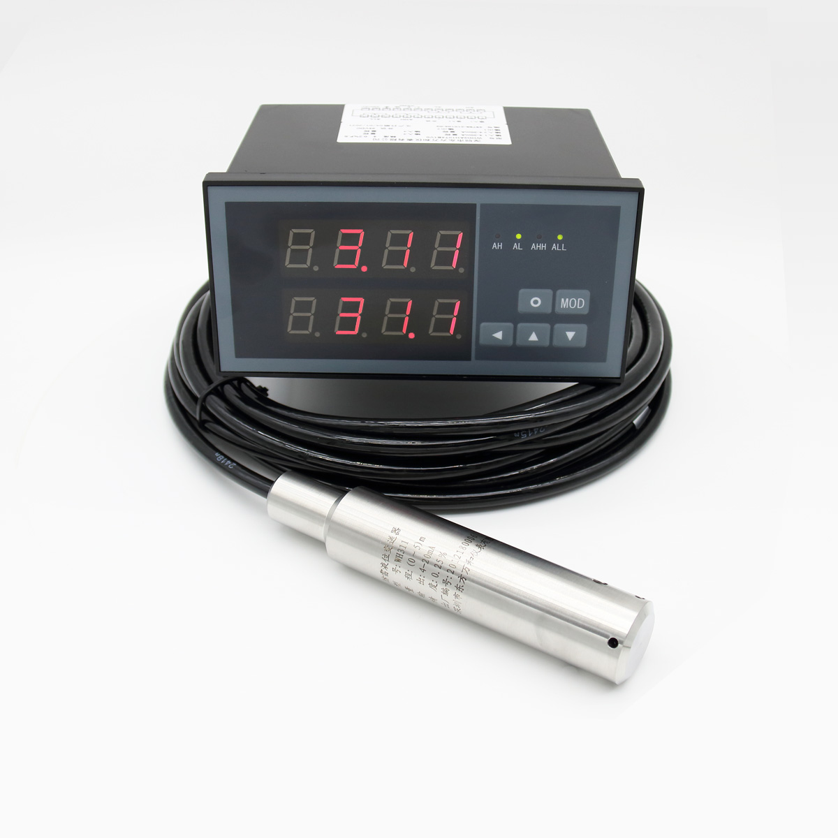 压力式水位计主体测量原理:根据压力与水深成正比关系的静水压力原理,运用水压敏感集成元器件做的水位计。当传感器固定在水下某一点时,该测点以上水柱压力作用于水压敏感集成元器件,使元器件电阻发生变化,从而导致电压变化,这样即可间接测出该点的水位。